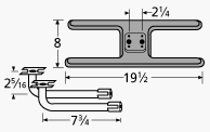 Thermos H-Shaped Twin Cast Iron Burner L-Shaped Venturi. Burner: 8 x 19 1/2 inches. Venturi: 2 5/16 inches top to center, 7 3/4 inches center to end.
